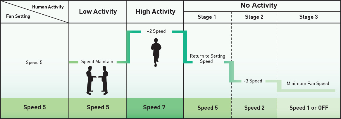 - Fan will reduce three speed from user's setting speed after 5 minutes. If no movement occurs in next approximate twenty minutes, fan will reduce to user's minimum fan speed settting.