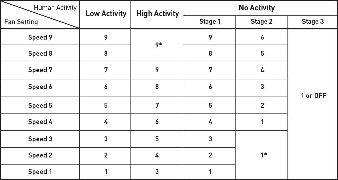 * Indicates the maximum speed and minimum speed after changing speed during High Activity and No Activity. Maximum fan speed is Speed 9. The speed will not increase more than Speed 9 during High Activity. Minimum fan speed is Speed 1 or OFF. The speed will not decrease lower than Speed 1 or OFF during No Activity.