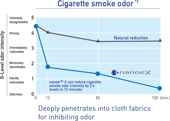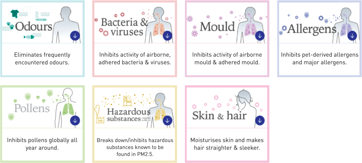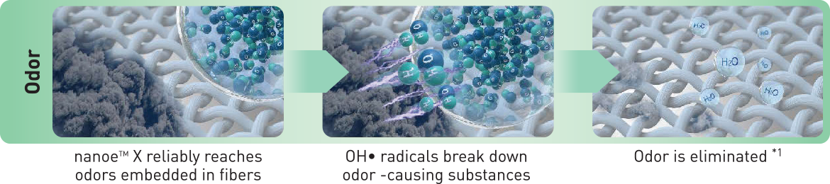 The deodorization effect varies according to the environment (e.g., temperature and humidity), operation time, odor, and fabric type. It does not eliminate the toxic substances in cigarettes (e.g., carbon monoxide). Odors that are continuously generated (e.g., building material and pet odors) are not completely eliminated. Results may vary based on usage and seasonaVenvironmental variables (e.g., temperature and humidity). nanoe™ X and nanoe™ inhibit activity or growth of viruses, but do not prevent infection.