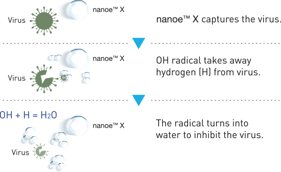 A nanoe™ X is a fine (5 to 20nm) and weak acidic water particle with a reactive substance and an electric charge. A nanoe™ X device releases radicals in water molecules which effectively inhibits viruses, bacteria, odors and allergens. The effectiveness of virus and bacteria inhibition*, depends on the number of OH radical.*2