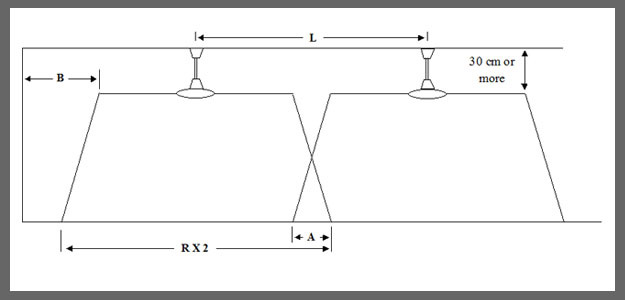 L : (RX2) - 0.4 , where 0.4 is maximum allowable overlapping of air throw between fan
